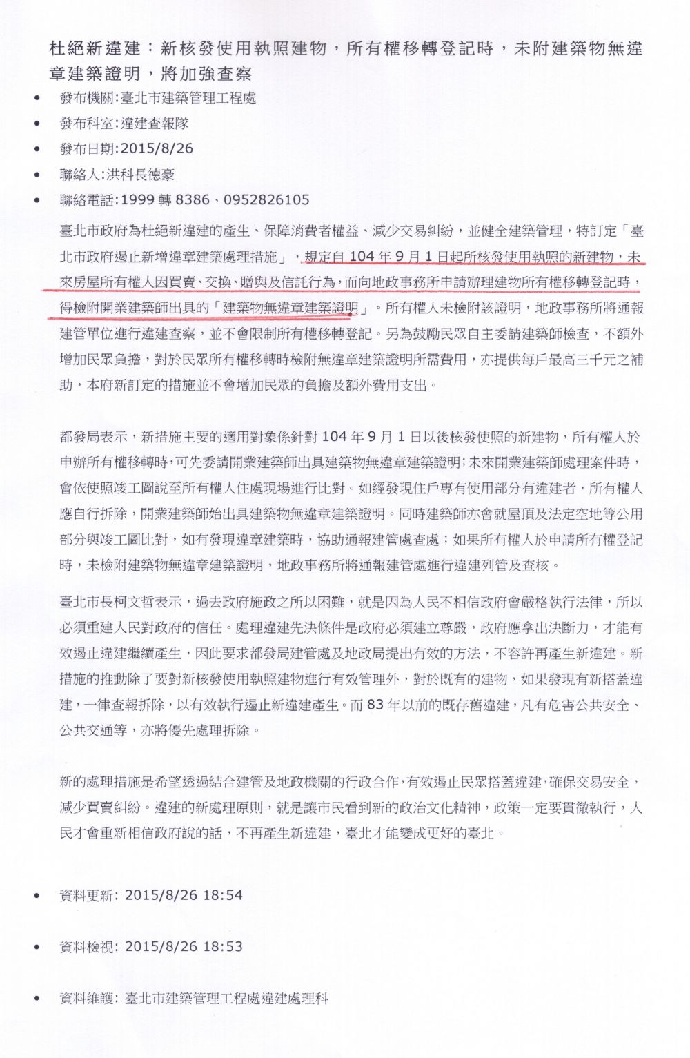 台北市:新核發使用執照建物,所有權移轉登記時,未附建築物無違章建築證明,將加強查察