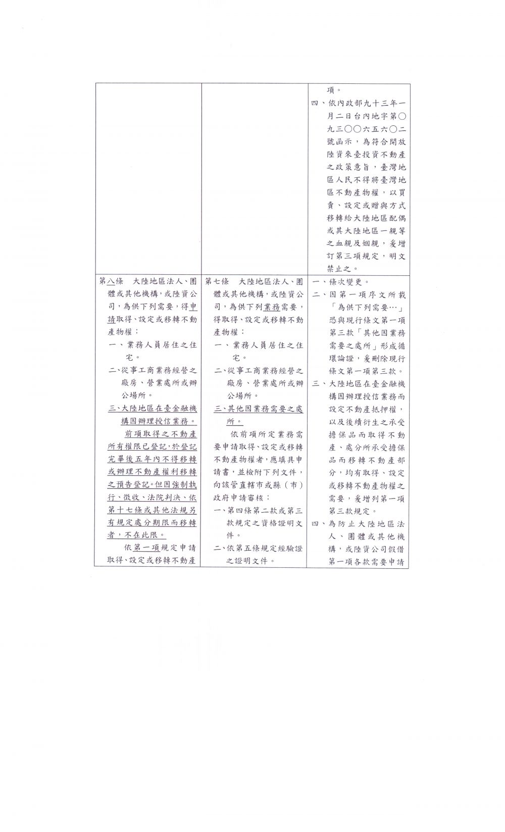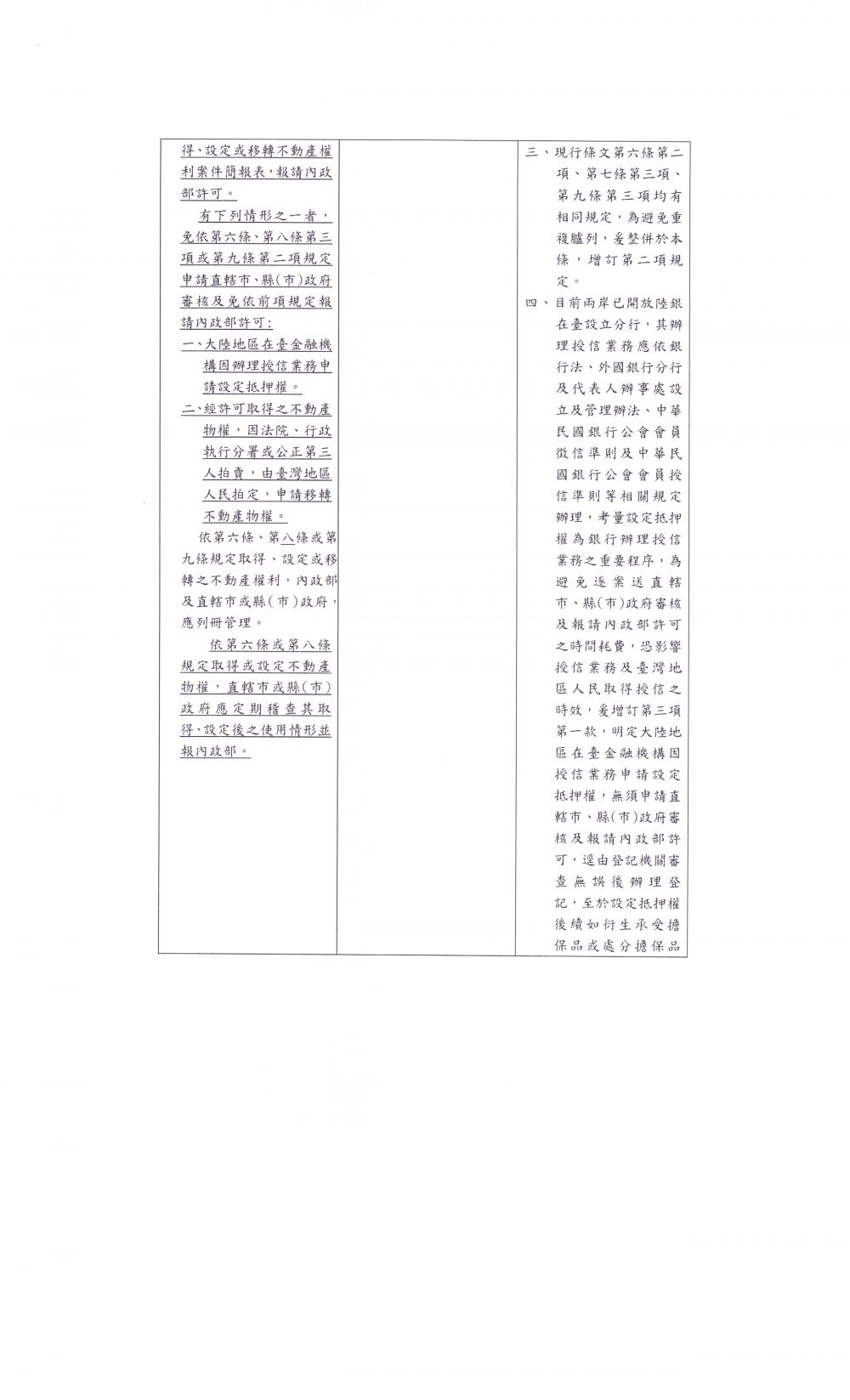 四、修正大陸地區在臺金融機構因辦理授信業務需要,得申請取得、設定或移轉已登記不動產物權,另明定大陸地區法人、團體或其他機構,或陸資公司於登記完畢後五年內不得移轉或辦理土地權利移轉預告登記,及增訂申請時應附之文件。(修正條文第八條)