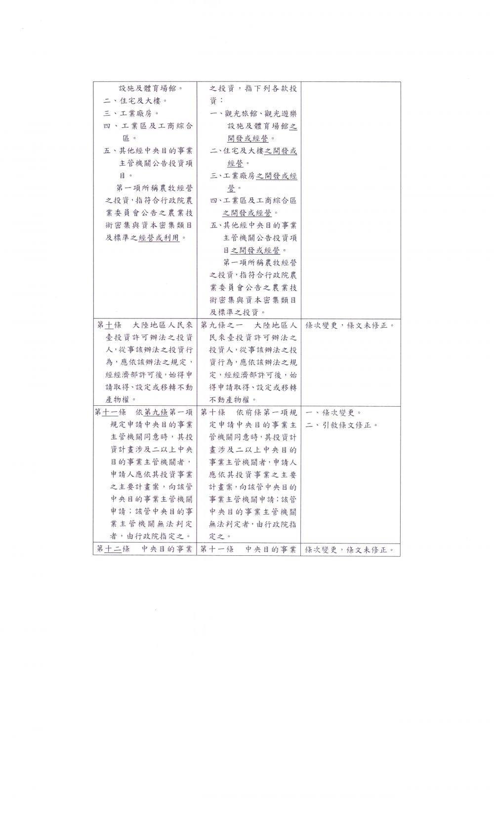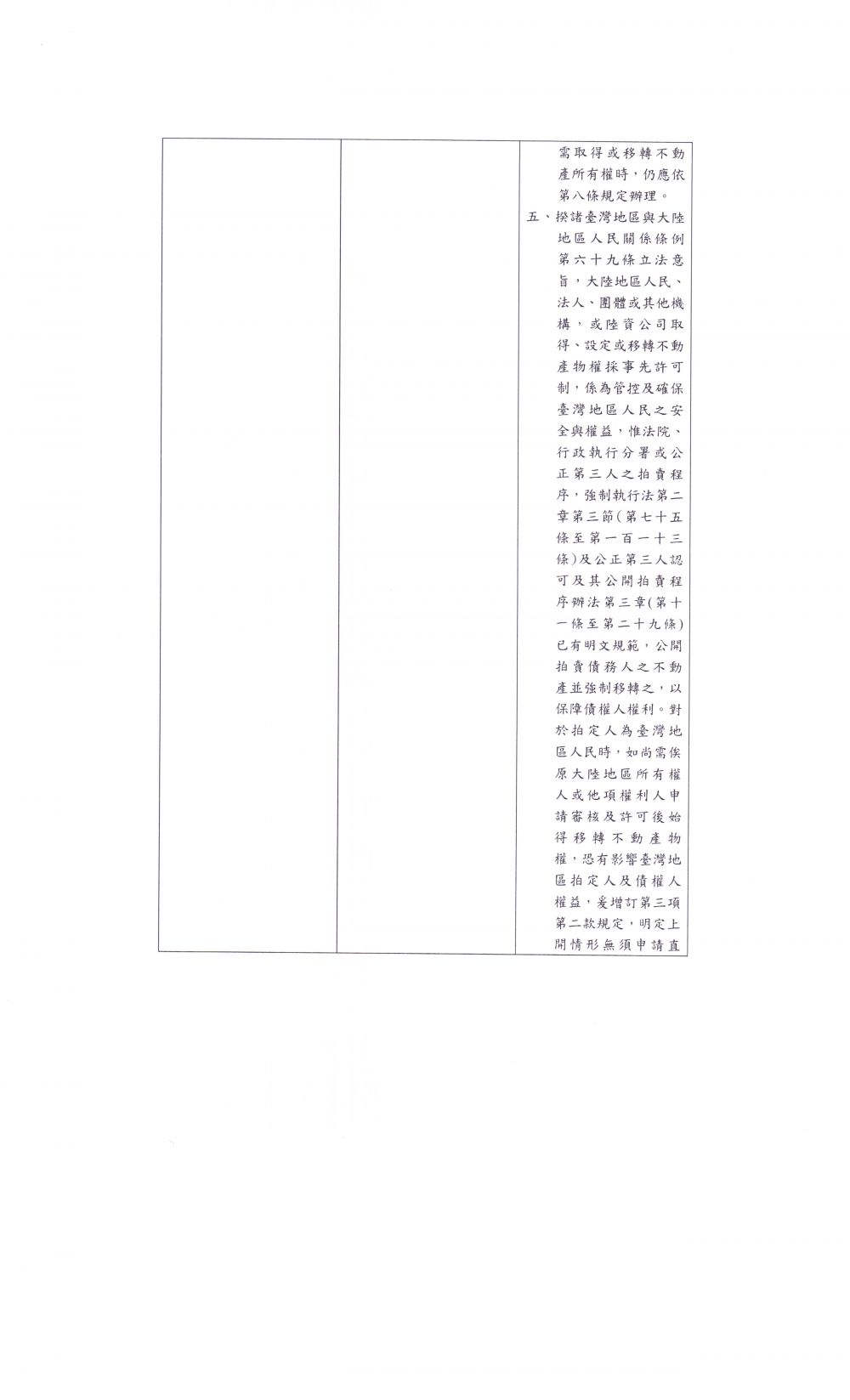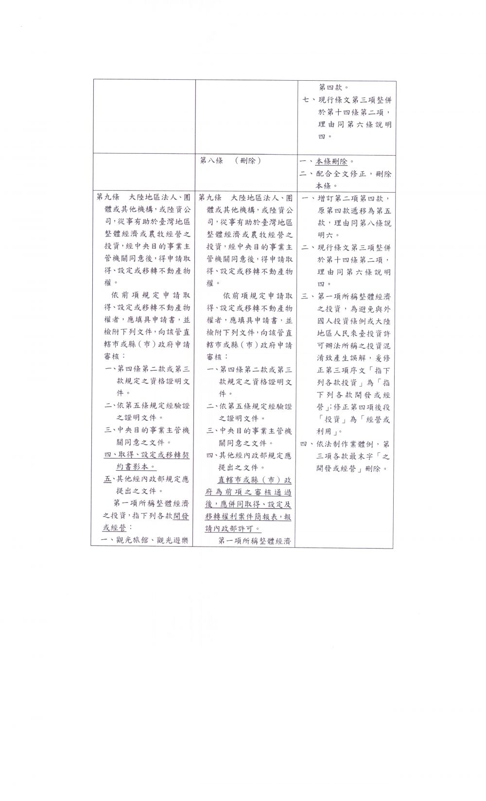 五、修正大陸地區法人、團體或其他機構,或陸資公司從事有助於臺灣地區整體經濟或農牧經營之投資,經中央目的事業主管機關同意後,申請取得、設定或移轉不動產物權所應附文件。(修正條文第九條)