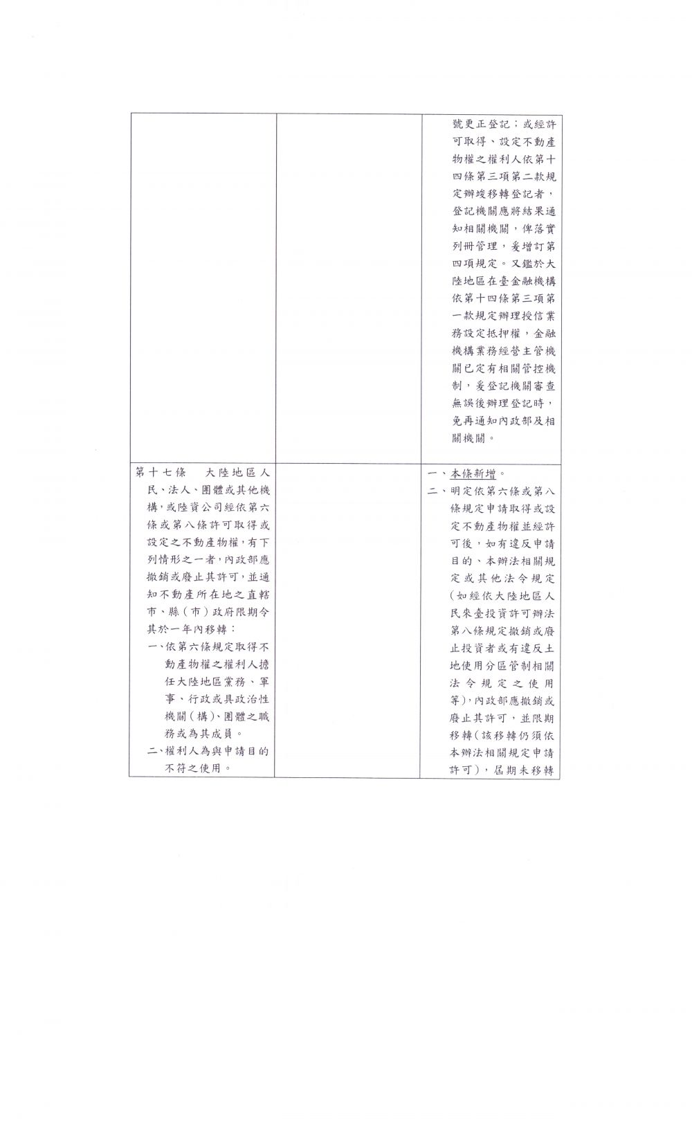 八、增訂已許可取得或設定之不動產物權,應撤銷或廢止許可之情形及相關處理方式。(修正條文第十七條)