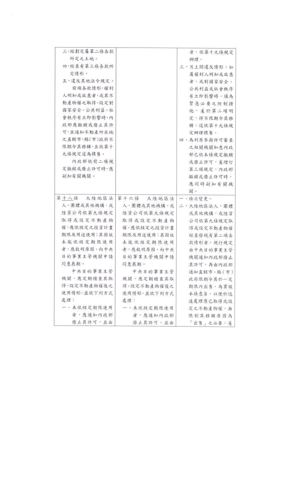 九、修正大陸地區法人、團體或其他機構,或陸資公司依第九條規定取得或設定不動產物權,經中央目的事業主管機關稽查發現有違反相關規定,內政部通知直轄市、縣(市)政府限期令其於一定期限內處理不動產之方式。(修正條文第十八條)
