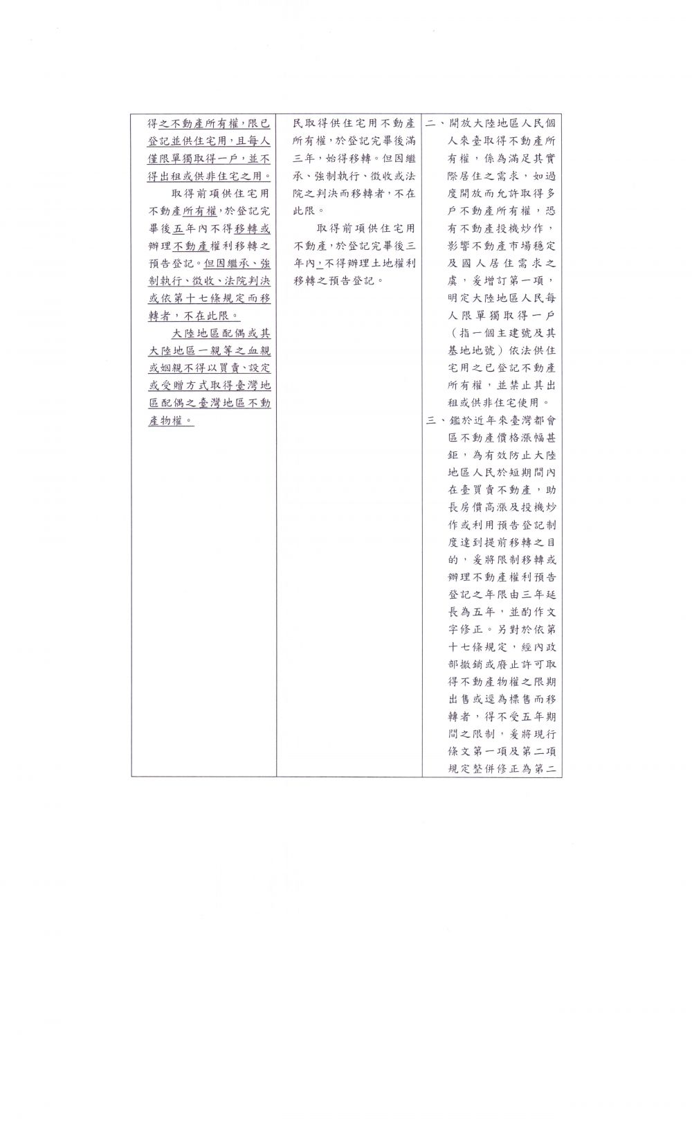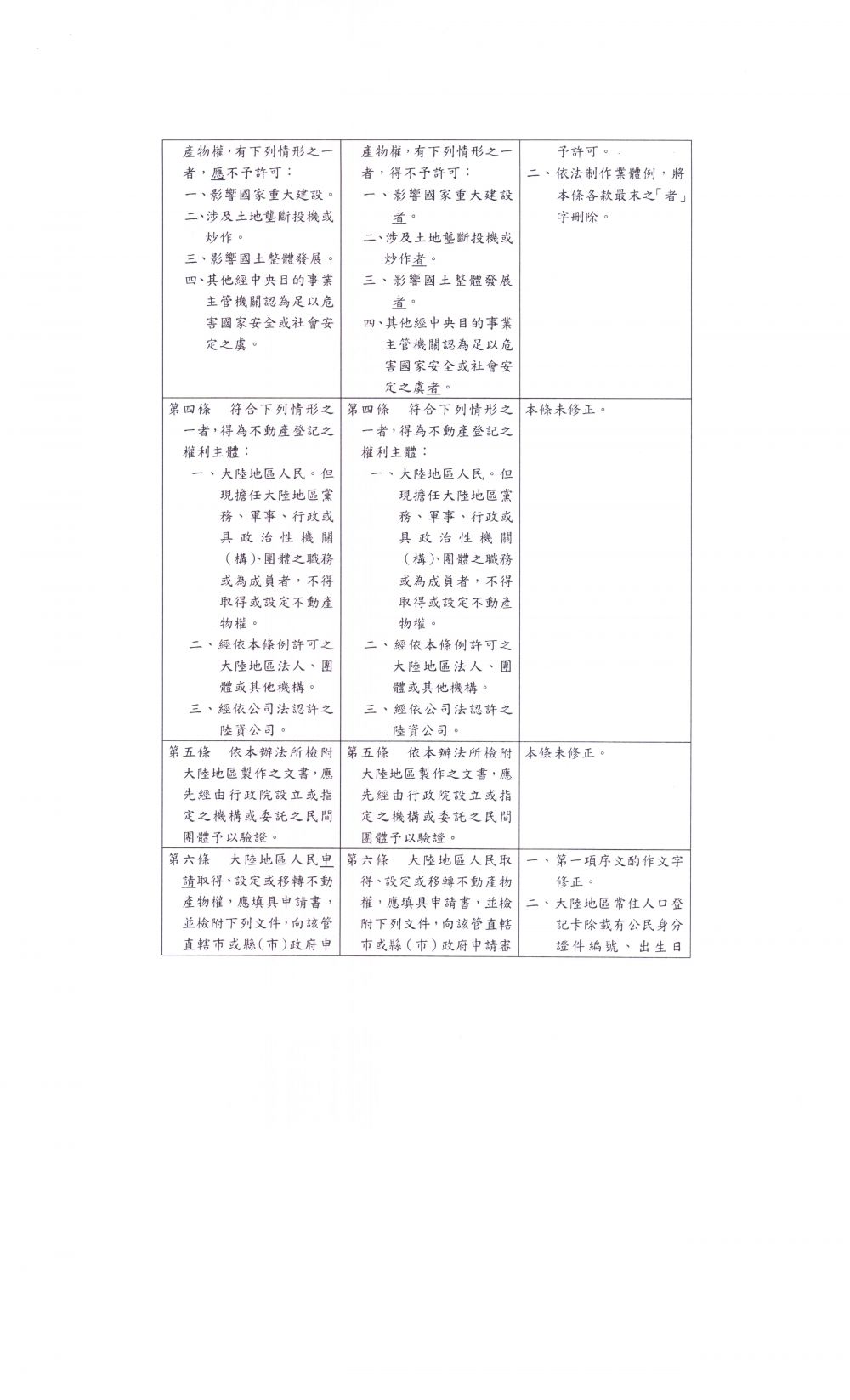 三、增訂大陸地區人民取得之不動產,限已登記並供住宅用,且每人僅限單獨取得一戶,並不得出租或供非住宅之用,另禁止大陸地區配偶或其大陸地區一親等之血親或姻親以買賣、設定或受贈方式取得臺灣地區配偶之臺灣地區不動產物權;不動產所有權登記完畢後再移轉或辦理土地權利移轉預告登記之年限,由三年修正延長為五年。(修正條文第七條)