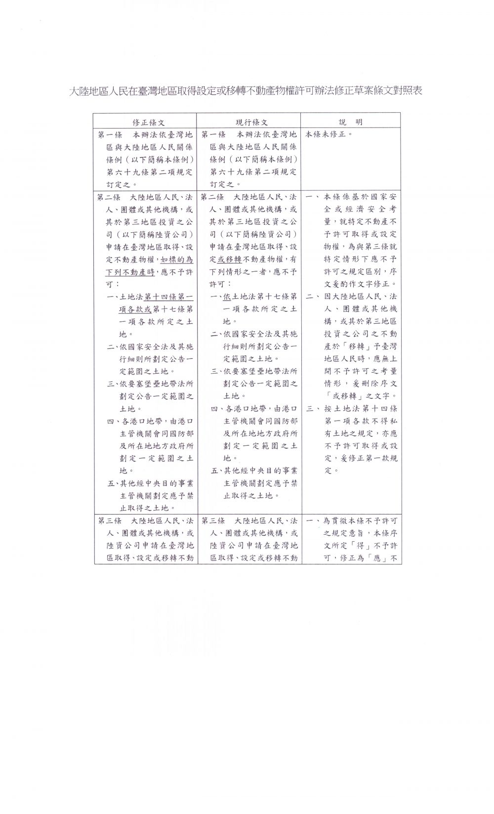 大陸地區人民在臺灣地區取得設定或移轉不動產物權許可辦法修正草案總說明