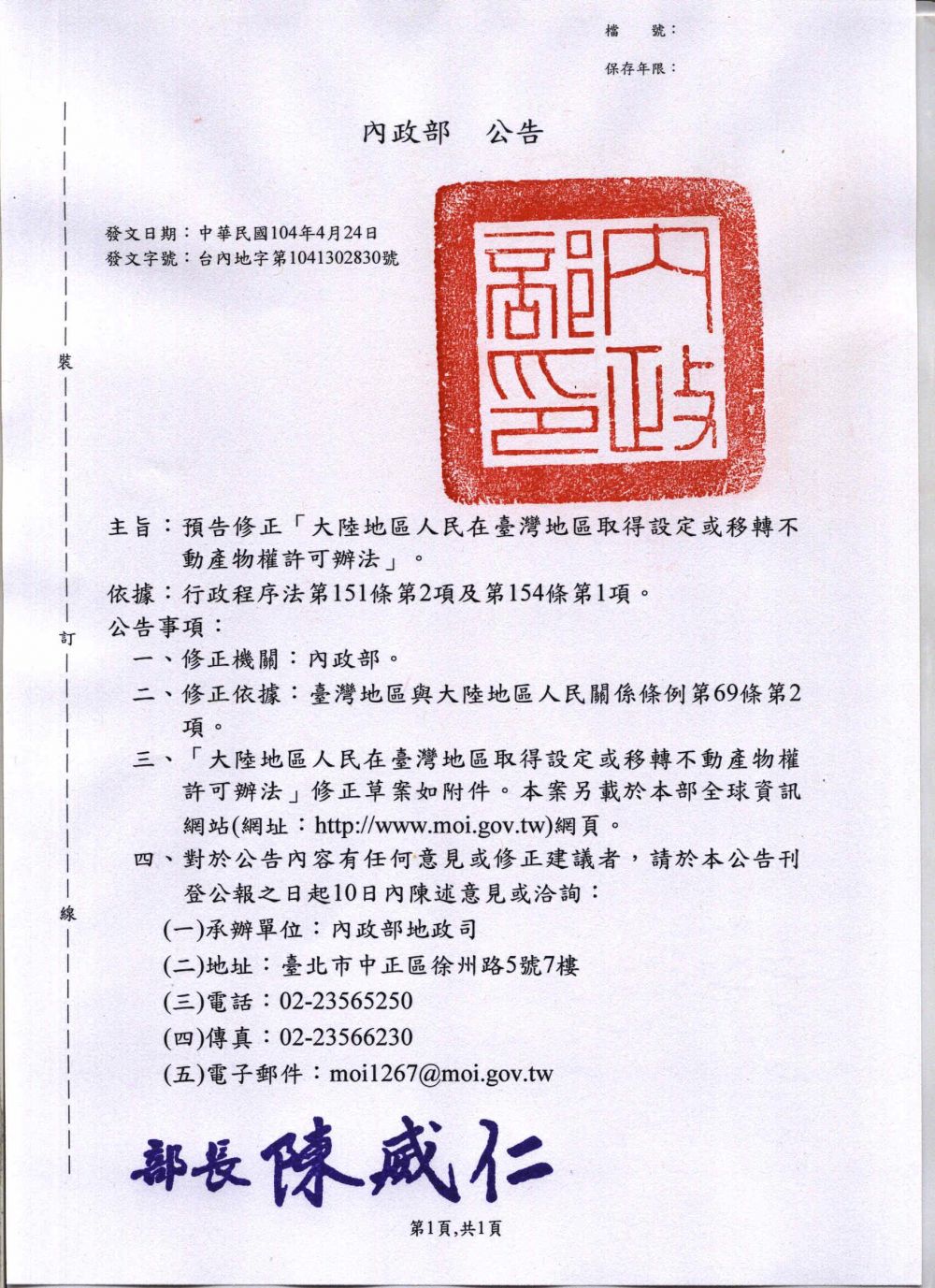 內政部依據臺灣地區與大陸地區人民關係條例第六十九條第二項規定,訂定大陸地區人民在臺灣地區取得設定或移轉不動產物權許可辦法(以下簡稱本辦法),自九十一年八月八日發布施行,歷經二次修正。鑑於自九十八年起,許可陸資來臺取得不動產之案件逐年增加,國內都會區不動產價格持續高漲,為防範陸資來臺炒作,影響國內不動產市場穩定、國人居住需求及國家安全,經評估兩岸發展現況並為落實陸資在臺取得不動產之有效管理及因應實務執行作業需要,爰擬具本辦法修正草案,其修正要點如下:
