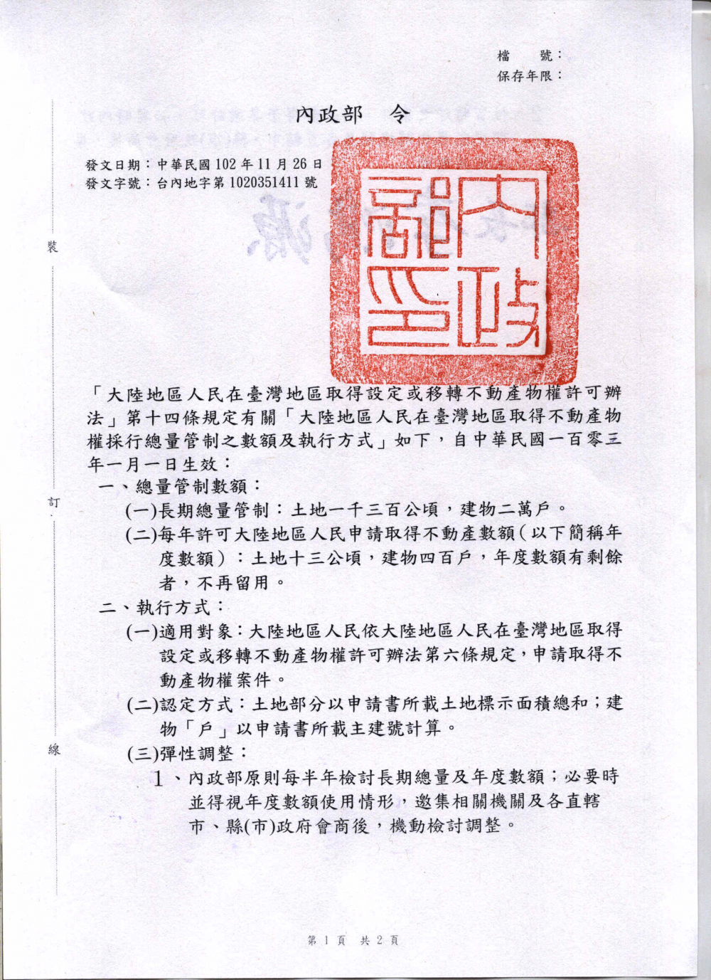 內政部訂定發布「大陸地區人民在臺灣地區取得設定或移轉不動產物權許可辦法」第14條規定有關「大陸地區人民在臺灣地區取得不動產物權採行總量管制之數額及執行方式」,並自103年1月1日生效一案。